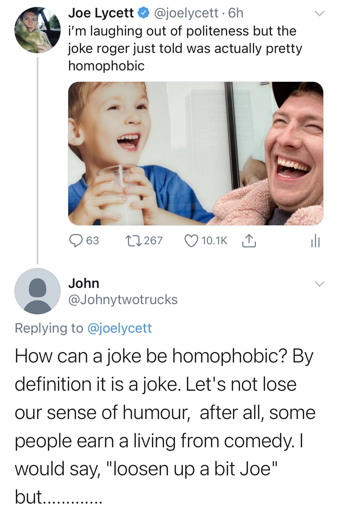 Joe Lycett On Twitter I M Laughing Out Of Politeness But The Joke Roger Just Told Was Actually Pretty Homophobic Https T Co 5pf5umhjfr Twitter